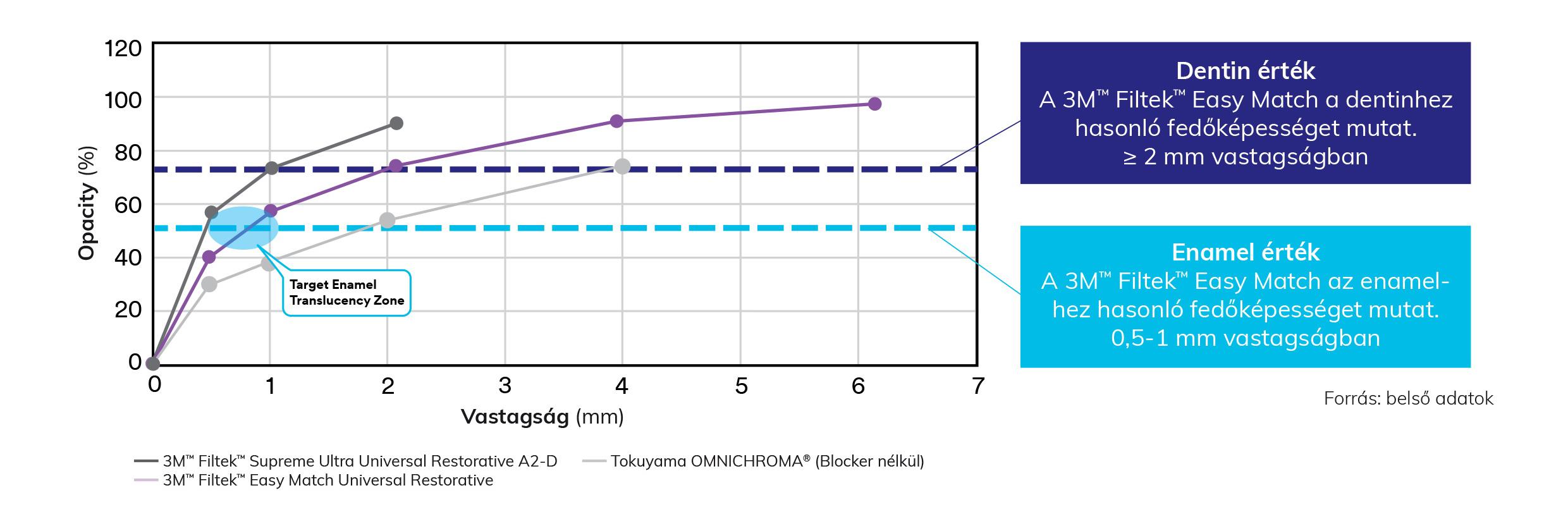 Néhány egyszínű rendszerrel ellentétben a 3M™ Filtek™ Easy Match Universal Restorative nem igényel blokkolót a szájüreg sötétségének elfedéséhez az elülső restaurációkban. Természetes alkalmazkodó opacitása 0,5-1 mm vastagságban zománchoz hasonló áttetszőséget biztosít - pontosan ott, ahol a ferde és metszőélhez szükséges. Mindenhol máshol ≥2 mm vastagságban dentinszerű opacitást biztosít.