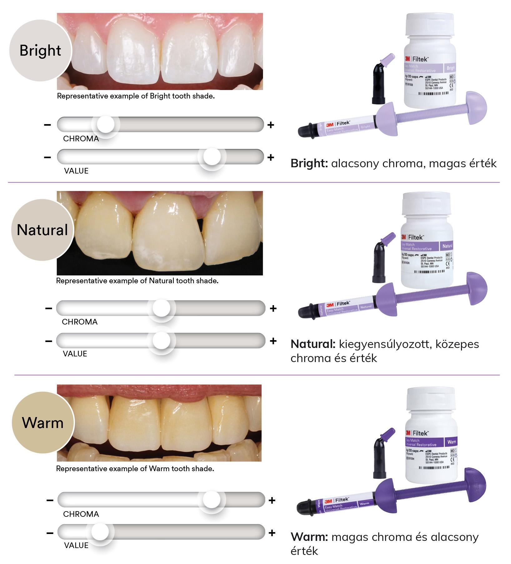 Fényes. Természetes. Meleg. Mindössze 3 árnyalat kiválóan illeszkedik szinte minden páciens mosolyához. Ez egyszerűbb munkafolyamatot jelent az egyszínű restaurációkhoz - olyan természetes megjelenésű eredményekkel, amelyekre büszkék lehetnek páciensei. A 3M™ Filtek™ Easy Match univerzális restaurációs anyag egy klinikailag bizonyított nanotechnológiára épülő, racionalizált rendszer, amely a világszerte megbízható 3M™ Filtek™ fogászati restaurációs anyagok családjának egyik védjegye. Leegyszerűsíti az árnyalat-megfeleltetést, mivel lehetővé teszi, hogy a megfigyeléstől a kivá-lasztásig gyorsan és intuitív módon jusson el. Anterior vagy poszterior. Blokkoló nélkül - és az opacitás feláldozása nélkül.